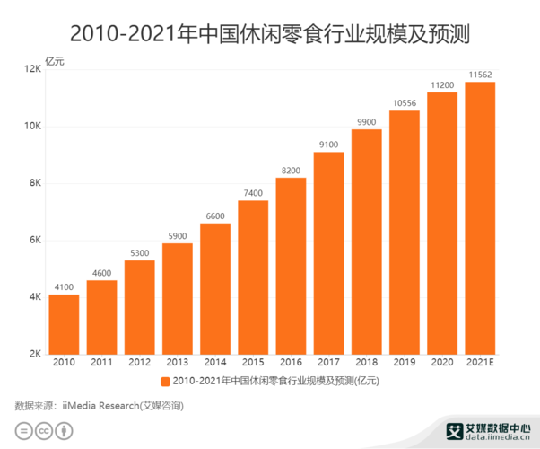 资本关注临期商品市场,不太可能是盲目追捧,一定是经过数据推演和估算的。随着消费升级步伐加快,新兴零售渠道快速兴起,零食行业在快速消费品市场中占有,优势,成为未来快速消费品市场中,前景、最有活力的行业。近几年来,我国零食市场一直保持着逐年增长势头,据艾媒咨询数据显示,从2010-2021年中国休闲零食行业规模及预测数据来看,自2010年起总体行业规模呈现梯形增长态势,2016年休闲零食行业规模为8200亿元,2018年扩大到9900亿元,2019年持续增长为10556亿元,预计到2020年其市场规模将达到11200亿元。