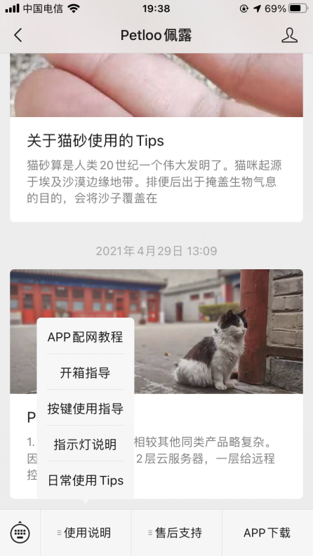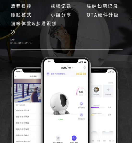 猫咪的每次如厕行为,都会被内置的摄像头完整记录并存储。通过手机APP进行交互呈现,猫咪如厕过程能直观地在手机上看到。其他时间,频率,体重变化等信息,也能在手机上查阅。▼