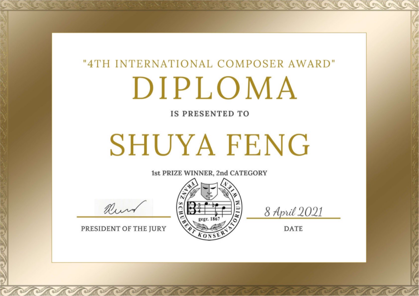 2021年4月至2021年9月,上海音乐学院作曲指挥系大一新生冯书雅(作品创作指导老师:居文沛副教授)尚在上海音乐学院附中高三年级升学毕业之际参加了七个国际作曲比赛,荣获十五项奖项:
