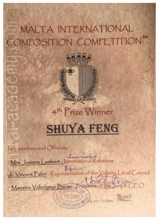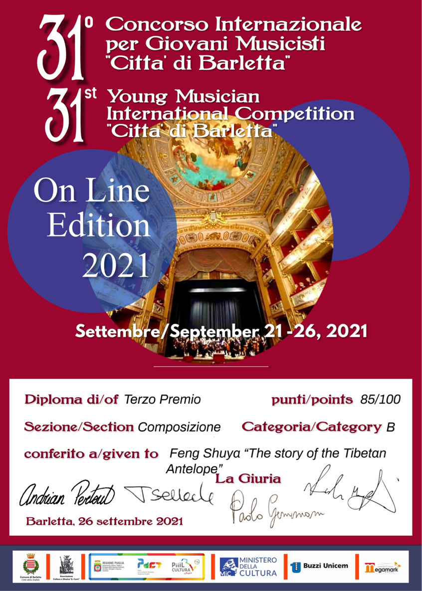 2021年7月,弦乐四重奏《藏羚羊的故事》荣获马耳他国际作曲比赛四等奖。