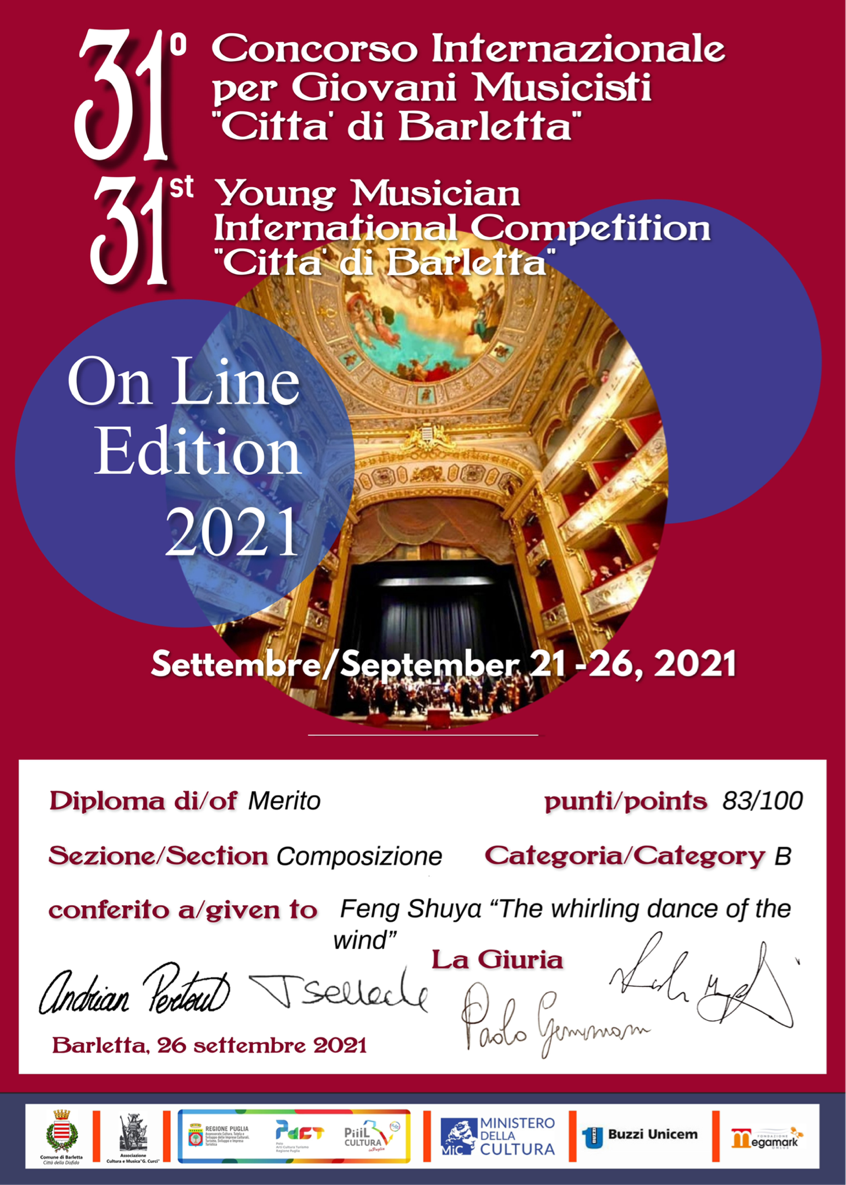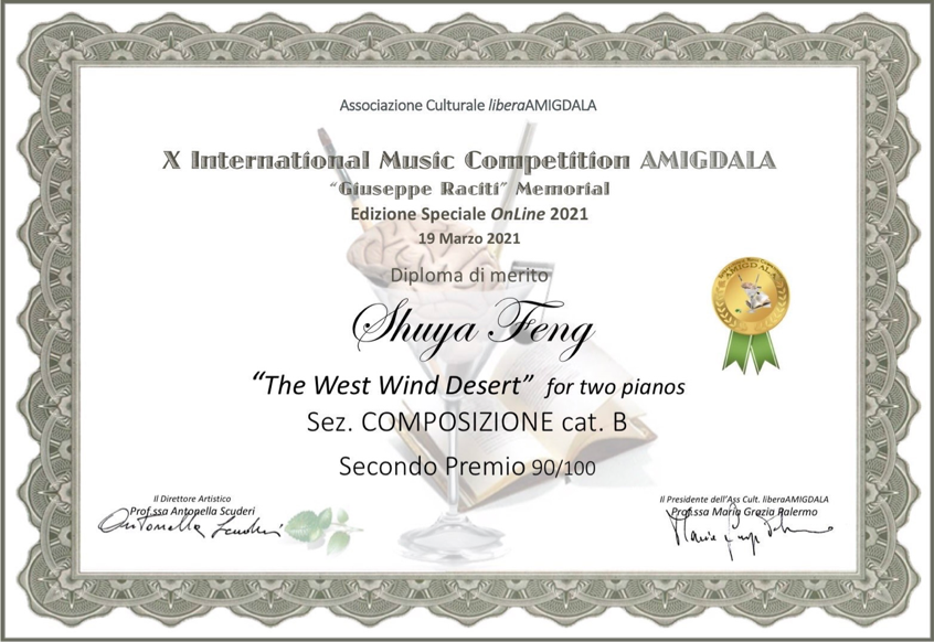 2021年4月,在第十届意大利阿米戈达拉国际作曲比赛中,双钢琴作品《西风瀚漠》(2020年创作)荣获二等奖、大提琴与钢琴二重奏《远古的回声》(2017年创作)荣获三等奖、钢琴独奏《自然的独白》(2020年创作)荣获四等奖;