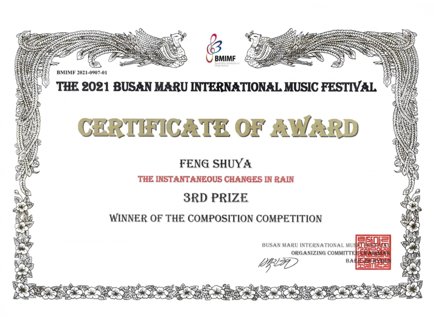 2021年9月,打击乐六重奏《骤雨不定》荣获韩国釜山马鲁国际作曲比赛三等奖(一等奖空缺)。