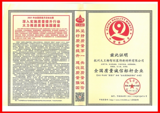 把住质量关口,促进诚信消费。为了提高全民质量意识,解决人民群众关心的质量问题。近日,中国质量检验协会公布了2021全国“质量月”活动成果。大王椰获得“全国质量诚信标杆企业”殊荣,这是企业获得的诚信肯定和质量认可。
