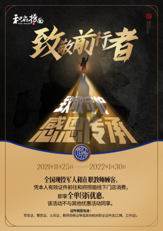 为了感恩回馈“负重前行者”,民族品牌和府捞面宣布,从11月25日起,全国在职教师和现役军人,可凭本人军官证、士兵证、教师资格证、工作证或其他相关有效职业证件,在和府捞面线下门店消费时享受全单8折优惠,活动将一直持续到除夕前。