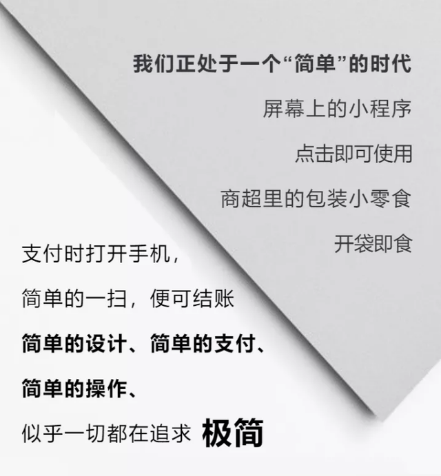 而在生活的各个方面中,简约亦是美感,效率的提高与操作的简化正是“简单”所带来的直观享受,在这个时代,一切都要化繁为简。