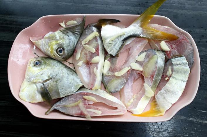 首先是食材处理过程。将金鲳鱼收拾干净,刀斜45°把鱼肉切成厚度约1厘米的鱼片;再将鱼片铺在盘子里,倒入少许料酒,鱼两面撒盐,放入姜片和蒜片,腌制20分钟;之后去掉姜蒜,用厨房纸吸走表面水分,再撒上一点玉米淀粉。到这一步,所有食材就处理完毕了。