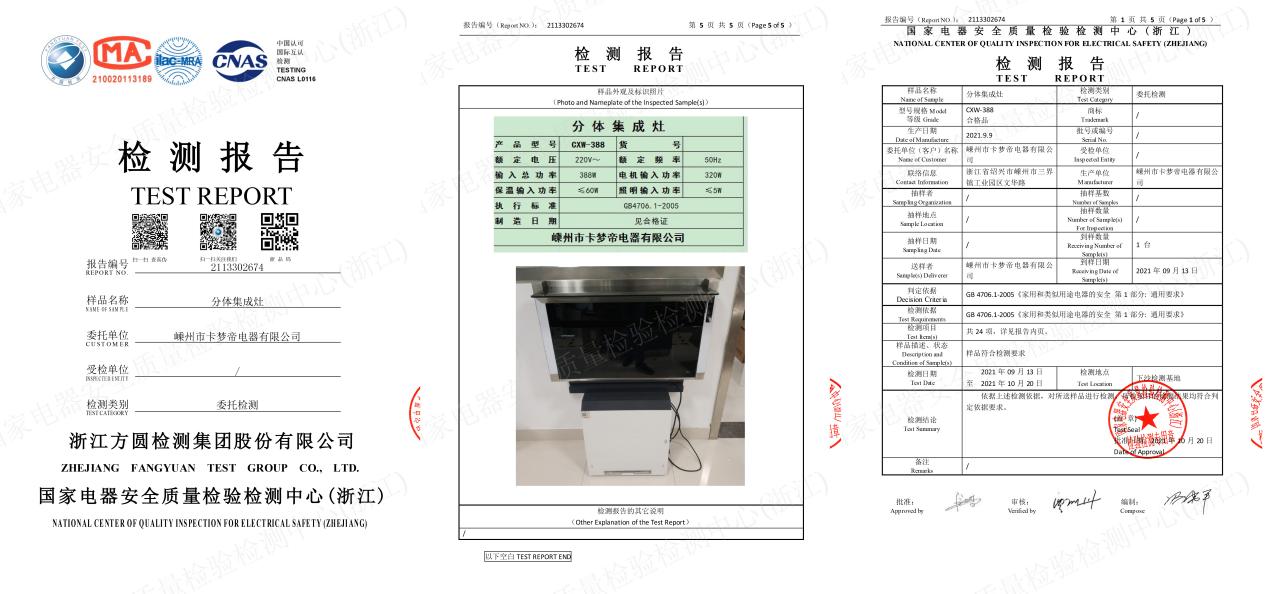 过硬的产品品质不畏考验!卡梦帝分体集成灶成功获得了由浙江方圆检测集团股份有限公司核发的产品检测报告。此次检测的顺利通过是对卡梦帝产品质量的又一次权威性肯定,同时也再次证明了卡梦帝产品的,品质。