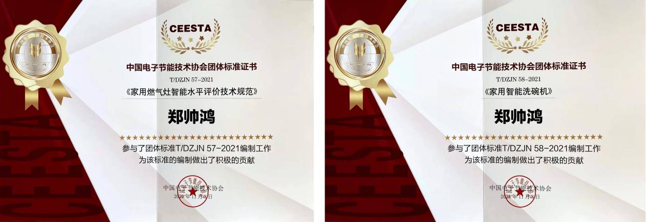 卡梦帝电器总经理郑帅鸿获得中国电子节能技术协会颁发的《家用燃气灶智能水平评价技术规范》、《家用智能洗碗机》的标准编制工作做出积极贡献荣誉证书!