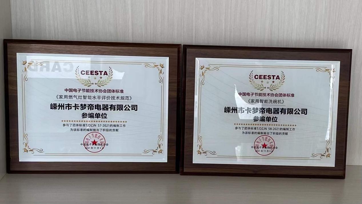 卡梦帝电器获得中国电子节能技术协会颁授的《家用燃气灶智能水平评价技术规范》、《家用智能洗碗机》的标准编制工作做出积极贡献荣誉证书!获此殊荣,是业界和权威机构对卡梦帝电器的又一次肯定,更是对卡梦帝品牌的高度认可。