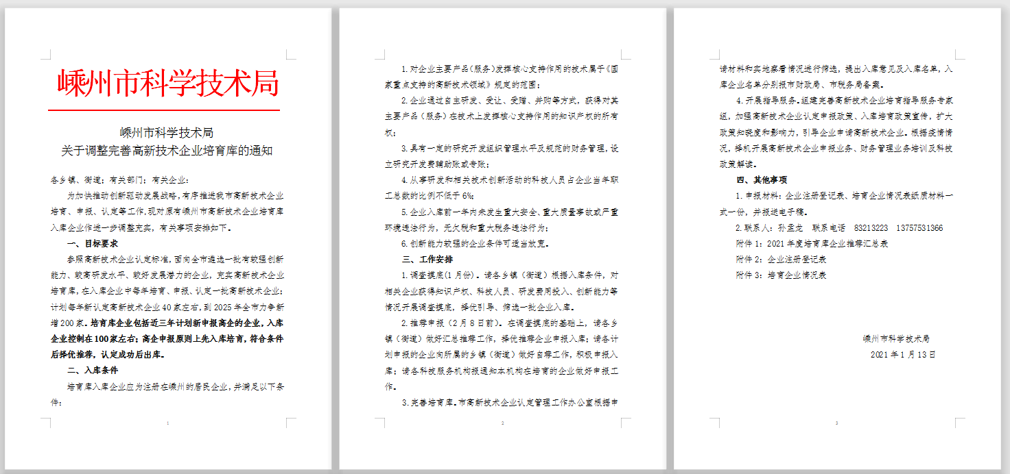 为加快推动创新驱动发展战略,嵊州市科学技术局下发2021年度《关于调整完善高新技术企业培育库的通知》文件,面向全市遴选一批有较强创新能力、较高研发水平、较好发展潜力的企业,充实高新技术企业培育库。卡梦帝电器凭借技术优势和研发能力,充分符合与满足入库条件,正式申报高新技术企业。