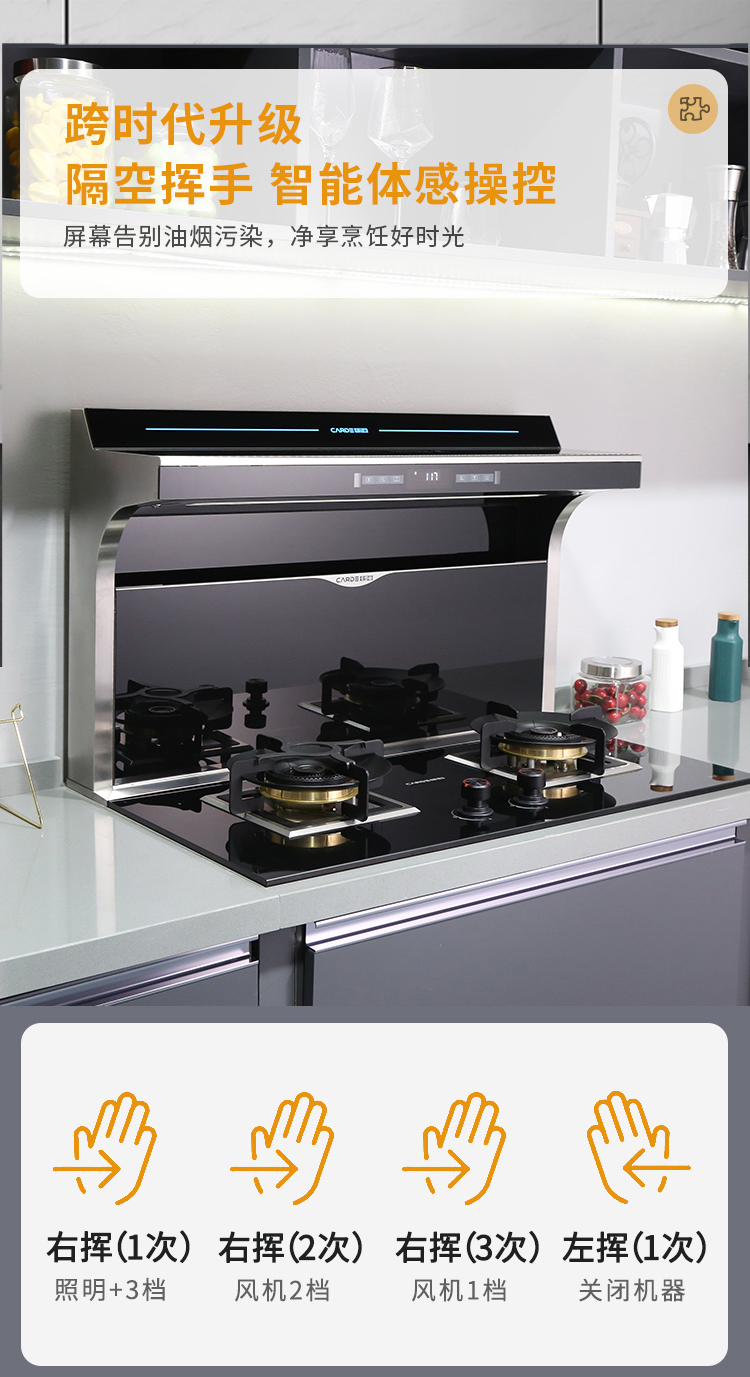 别担心,卡梦帝分体集成灶的智能体感操控,让你烹饪不再手忙脚乱,挥挥手完成排烟动作。智能化的操控不仅消除下厨的乏味和繁琐,炫酷的科技感更为下厨烹饪带来乐享智慧的有趣体验。