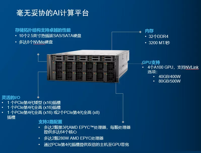 此外,所谓“工欲善其事必先利其器”,有好的方法论之外,借助强大的算力工具,更能让你事半功倍,加速成果产出。在这里小编向您推荐戴尔PowerEdge XE8545服务器,其采用双插槽的4U机架,最多包含128个第三代AMD霄龙处理器核心、四个NVIDIA A100 GPU以及NVIDIA vGPU软件所具备的优化性能,专为加速的工作负载而设计,使其成为,机器学习模型,复杂的高性能计算(HPC)和GPU虚拟化的理想选择。
