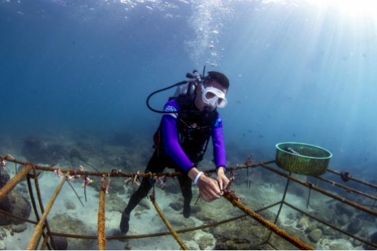 良好的海洋生态环境是蜈支洲岛的生命线,而珊瑚则是海洋生命的“发动机”。蜈支洲岛甚至珊瑚礁对海洋生态保护的重要性,因此一直将珊瑚保育作为景区发展的重要一环。近年来,海洋生态环境日益严峻,意识到该问题,蜈支洲岛再次吹响全民环保号角,将高热度潜水项目与公益项目珊瑚种植相结合,为游客提供免费种植珊瑚宝宝体验,让人人都能加入到保护玻璃海的队伍中,成为海洋公益的践行者,推动海洋公益实现“平民化”。