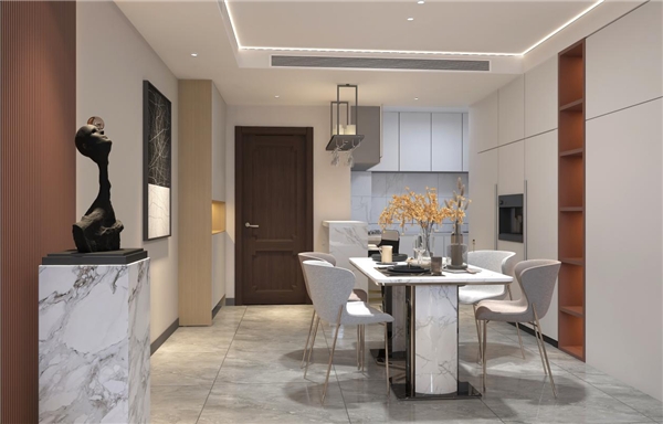 右侧设计吧台,既隔断了开放式厨房,还装饰了入户区,格调满满。内嵌整墙餐边柜,柜体与墙面同色,“隐形效果”很棒,横向空间感就此延伸。