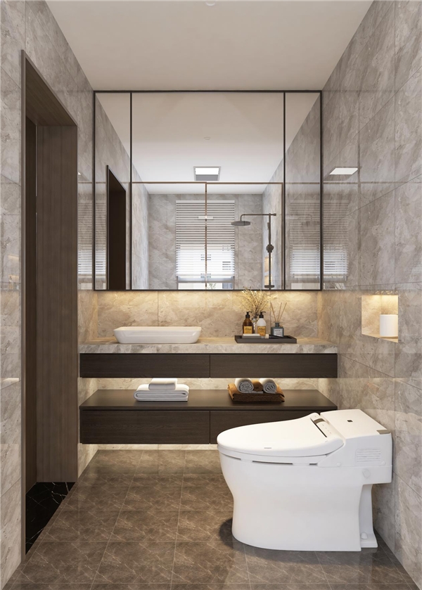 双吊柜+镜柜,再多的瓶瓶罐罐也能“藏”。马桶后和淋浴区都设计了壁龛,增加收纳。