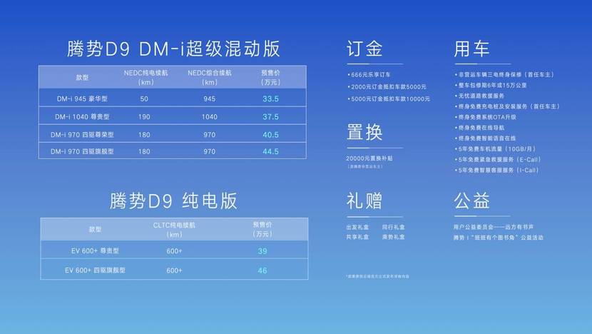 同时,腾势针对D9推出丰富的臻享豪华预定权益,预售期间下订D9的用户,可臻享多项豪华预定权益:权益一:享3档订车模式,让用户零风险享受大额现金权益。权益二:享4大用车保障,和5大智联在线,确保用户后期用车无忧。权益三:置换D9新车享20000元置换补贴,以,诚意回馈每一位忠实用户。权益四:大礼随处可见,订车礼盒拿到手软。权益五:成功支付意向金的用户,可共同参与品牌各类公益活动项目。