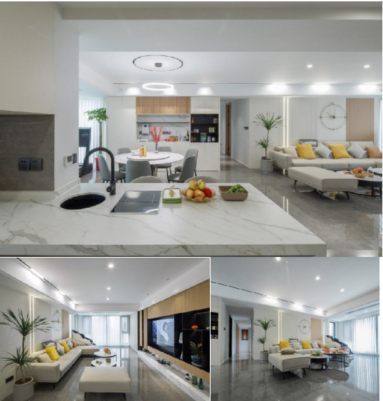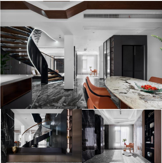 江南的精致,成就杭州的人居美学。设计师NiNi承袭着城市多年积淀的气质,骨子里流动着一份对美的执着。抛弃传统观念中对别墅豪宅的“刻板印象”,借助多种材质所营造的强烈对比感,让混搭与拼接升格空间的趣味性,让居住空间长期保持新鲜感。而现代感与自然元素融合的萨米特岩板,被选定为空间中的点睛之笔,光影之间跃动的纹理,生出丝丝通透的呼吸感。