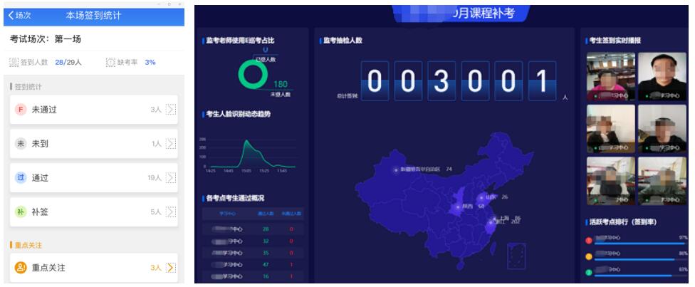 另外,E巡考小程序还特别增设了报警提醒功能。如考生未通过身份验证,系统将会立刻发出报警提示。所有考生的签到记录,系统会进行数据统计,可视化呈现,让监考、巡考工作一目了然。