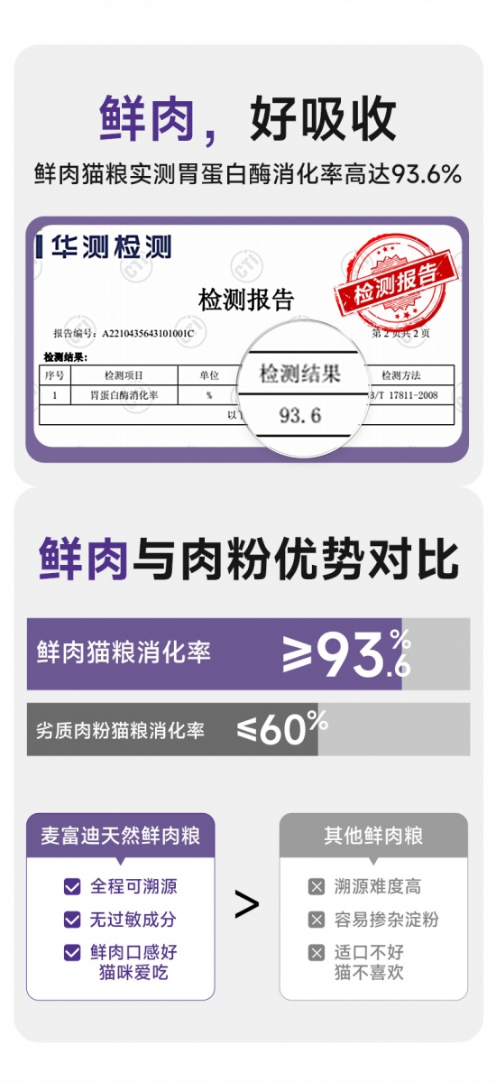 鲜肉消化吸收率高,这款粮实测胃蛋白酶消化率高达93.6%,这从根本上提高了消化吸收率,很多猫家长反馈猫咪吃了这款粮,粪便会便少,软便情况几乎没有发生了。