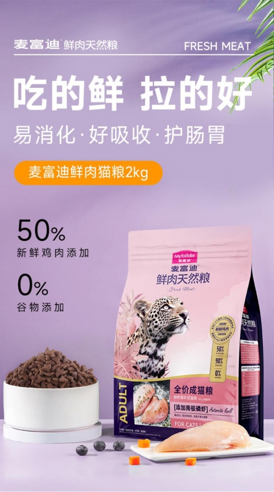 麦富迪是乖宝集团旗下品牌,集团自有工厂,比起代工厂更好把握产品品质。如此优质的鲜肉天然粮,如果你家小猫挑嘴或者玻璃胃,都可以试试哦~