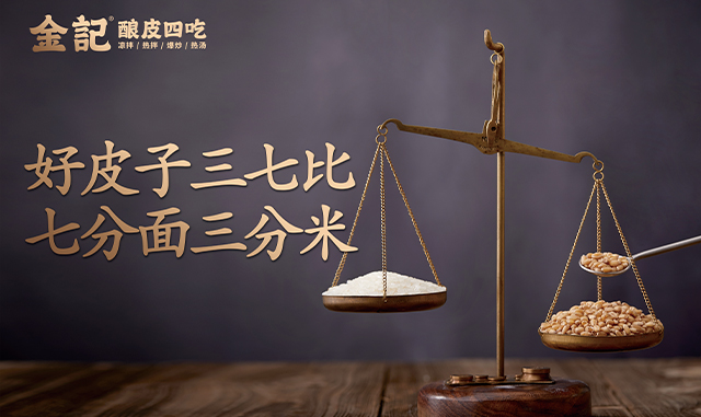 金记酿皮的创新则是从酿皮原浆开始就改变其构成,在10000平的金记食品工厂中,研发人员将不同产地的米、面原浆进行不同比例的调配,测试超过上万次,才找到了特定米面的原浆黄金比例,也就是现在金记酿皮对外反复强调的“好皮子三分比,七分面三分米”。