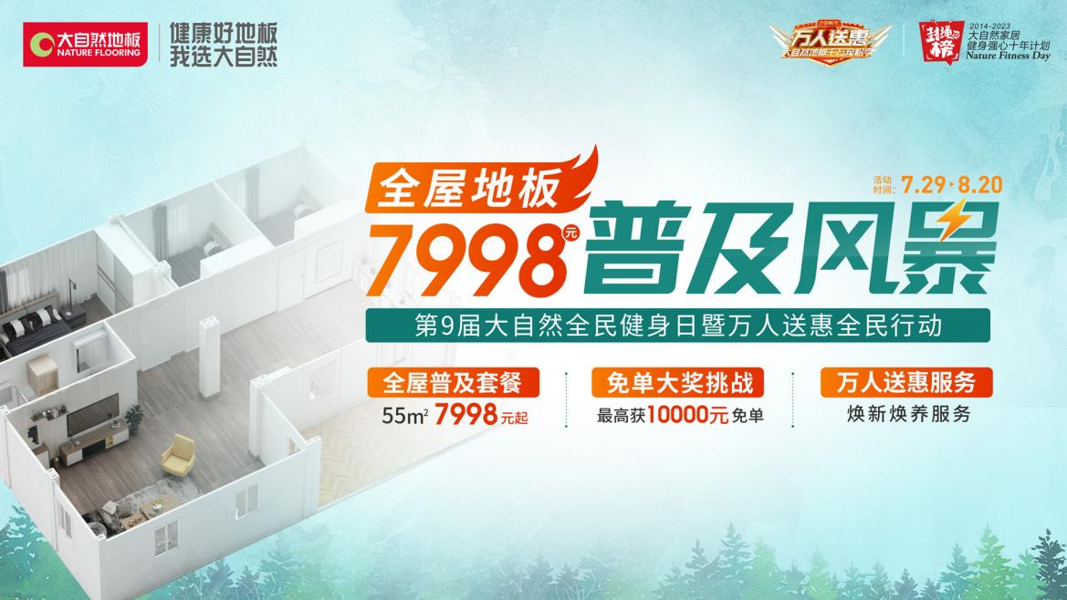 2022年8月8日是我国第14个“全民健身日”,为深入落实健康中国和全民健身国家战略,大自然地板从2014年开始坚持践行“健身强心十年计划”,倡导健康运动。2022年7月29日-8月20日,大自然地板正式启动第9届全民健身日暨万人送惠全民行动,号召更多人参与健身,传递健康生活方式。