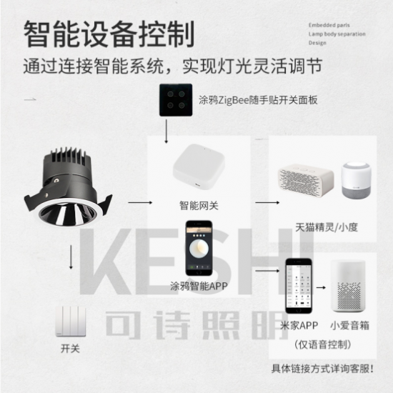 这款产品可接入天猫精灵、小爱同学、小度等智能音箱,支持米家、涂鸦智能APP远距离操作,且能通过智能网关实现多形式控制,可轻松实现对灯光色温、亮度的调节。若喜欢智能家居的消费者,就一定不能错过这款智能射灯产品。