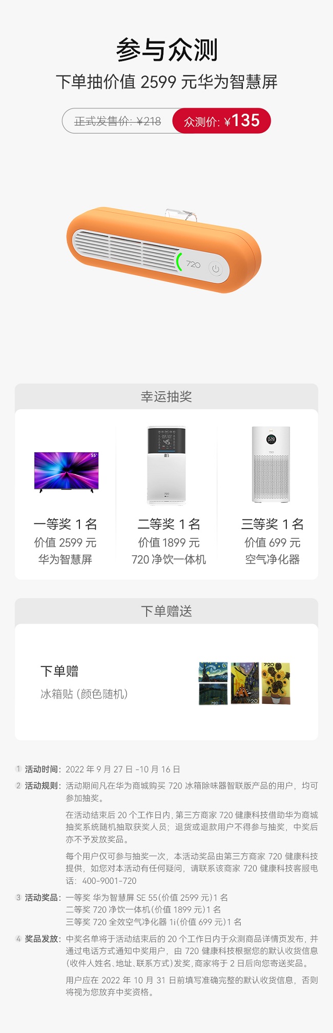 华为商城,众测:720冰箱除味器智联版,众测仅需135元,众测期间下单抽价值2599元华为智慧屏。