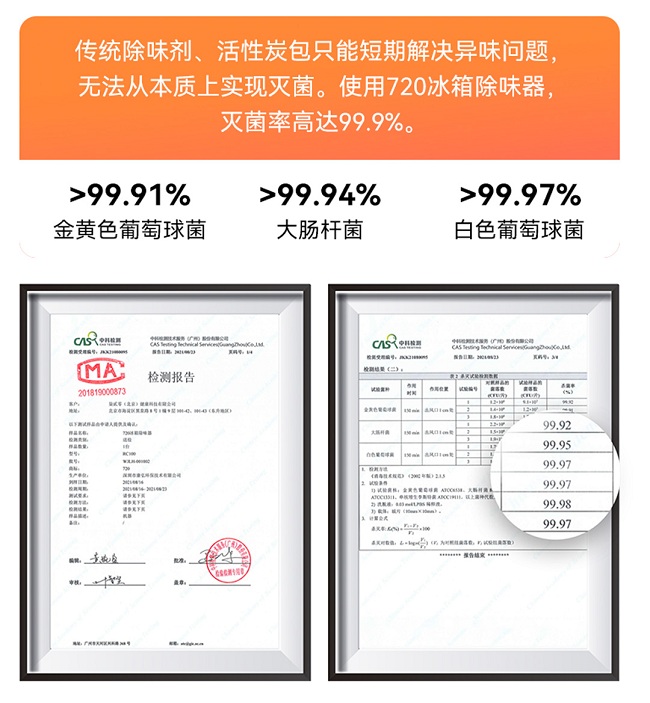 很多人觉得冰箱冷藏环境下细菌难以滋生,这其实一个误区,冰箱内部清洁不到位,食材混放等情况都会加速病菌繁衍,常见的就有大肠杆菌、金黄色葡萄球菌和沙氏门菌等,轻则引起腹部难受,重则导致腹泻和呕吐。而720冰箱除味器智联版内置风扇,能加速空气循环,让超氧+负离子360°覆盖冰箱内部,除味的同时能灭除99.9%的常见病菌,给全家人的健康保驾护航。