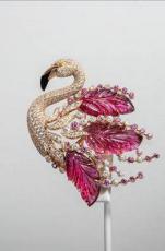 粉色火烈鸟是卡地亚动物主题作品中常见的鸟类形象。这款作品在传统自然主义风格中结合部分抽象手法,火烈鸟头部雕刻逼真,玫瑰金与缟玛瑙的组合突出鸟喙形象。三颗雕刻红碧玺跃然而出,羽毛以雕刻宝石与抽象线条交错显现,意趣十足。