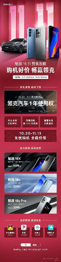 魅族双11预售活动从10月20日晚20点持续到10月31日晚20点,期间多款手机有降价活动。用户可享受无忧购机,全程保价,具体优惠政策如下: