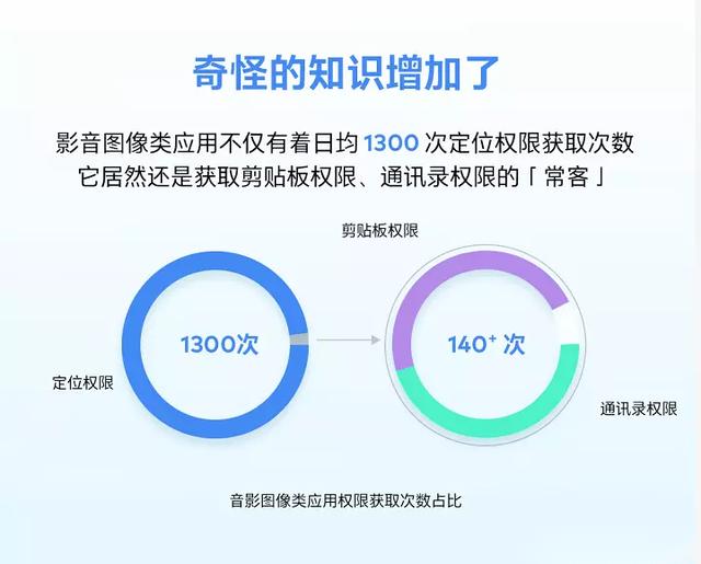 根据《Flyme隐私安全白皮书》的介绍,在我们参与统计的手机中,平均每日会有26783次应用行为,影音图像类应用更是有着日均1300次定位权限获取次数……虽然知道手机应用会收集用户数据,但如此频繁的获取权限和信息,还是非常令人担忧。