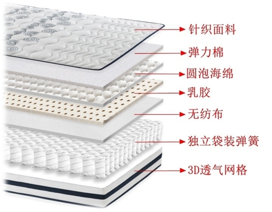不过大家也不用闻“甲醛”色变,只要床垫的甲醛含量不释放不超过≤0.05mg/m2就不会对人体产生伤害。床垫主体结构一般可概括为:面料层+弹簧层+填充层(乳胶、椰棕、海绵、代棕棉等)话不多说,上图更直观,而填充层才是甲醛超标的主要根源。