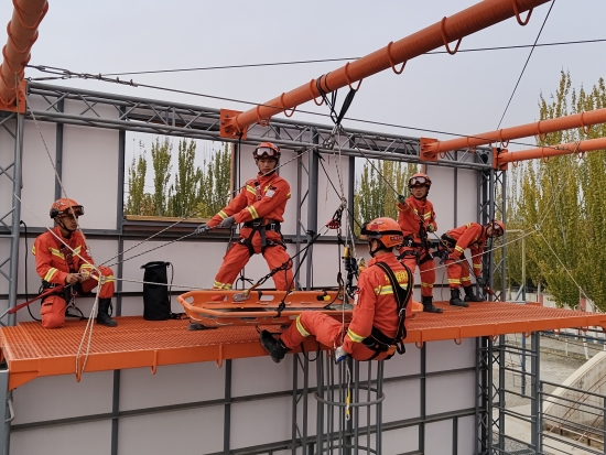 在地型复杂环境下利用绳索开展救援,是实施抢险救援的一种有效方法,加强绳索救援技术综合运用,对提高队员的应急处置和协同作战能力具有重要的实践意义。“系统搭建完毕,可以开始实施营救!”随着铿锵有力的口令下达,索降塔上的消防员随即展开绳索救援训练。眼神凌厉,动作迅猛有力,“12~12~12”流畅的配合声在训练场上回响。