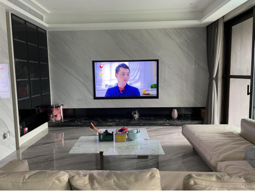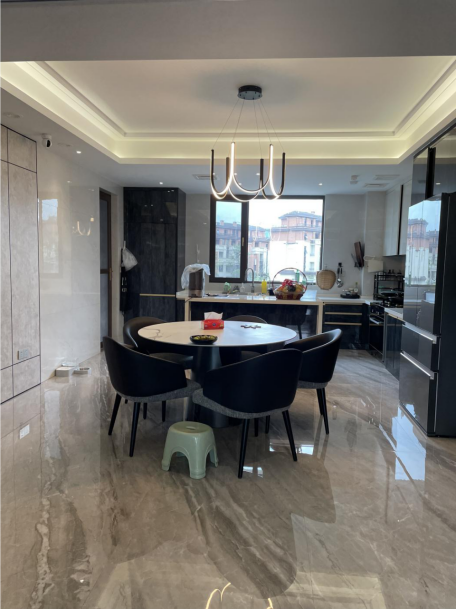 重修电路、铺贴瓷砖、粉刷墙面,让年久失修的老屋改换新颜,从原本的老干部风格转换为当下流行的轻奢风格,全靠大理石瓷砖的“加持”:客厅方面,地面和墙面我们都铺贴了简一的大理石瓷砖,地面使用了我的心上“白月光”简一希腊灰,电视背景墙则听取了设计师的意见,铺贴了简一的云雾白。软装上以灰色、黑色为主,进行色彩上的平衡,客厅简约感十足,自带轻奢格调。餐厅方面,地面依旧通铺简一希腊灰,灯光上则以暖色为主,据说可以提升食欲~值得一提的是,我们除了安装了具有设计感的吊顶外,还增加了暖色调的灯条!开灯后被亮面瓷砖这么一反射,,的氛围感立马就来了,超级赞!