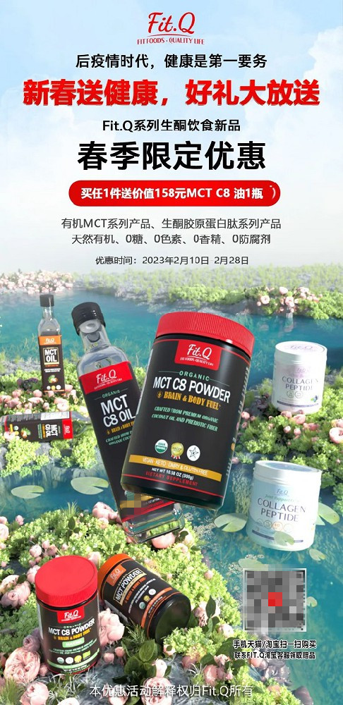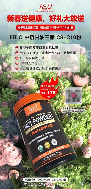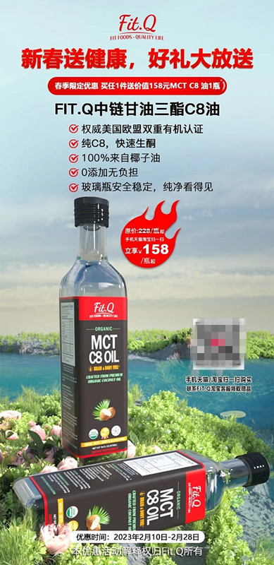 这个春天,Fit.Q想与大家一起追求健康生活,健康生酮。此次活动买任意1件即送价值158元 MCT C8 油1瓶,谁能不心动!Fit.Q MCT C8油可是号称“生酮加速器”,可以被肝脏快速代谢成酮体,给身体供给能量,加速身体进入酮症,不用挨饿也能瘦!此外它还具有美国欧盟有机双认证、Star-K 犹太洁食认证,并且考虑到油类食品的保存问题,Fit.Q特意采用玻璃瓶包装,更加安全稳定。