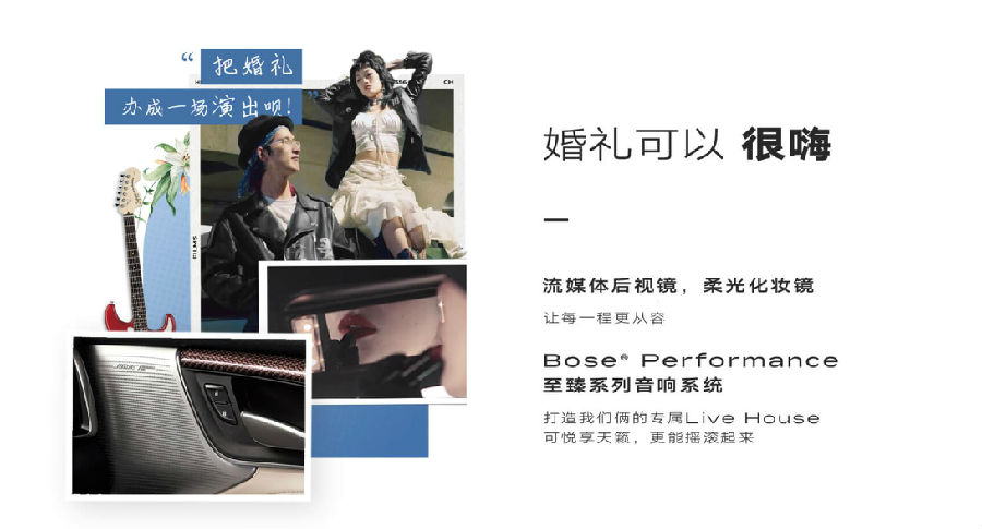 婚礼上音乐也是必不可少的存在,凯迪拉克CT5配备了Bose®Performance,系列音响系统,搭配15颗扬声器,营造宽广的沉浸式声场,身处车内犹如置身音乐厅,每个角落都能畅享动人音质。并且在大响度下不失真,婚礼音乐再大声也原汁原味,打造属于你的专属Live House,把婚礼办成演出都行。