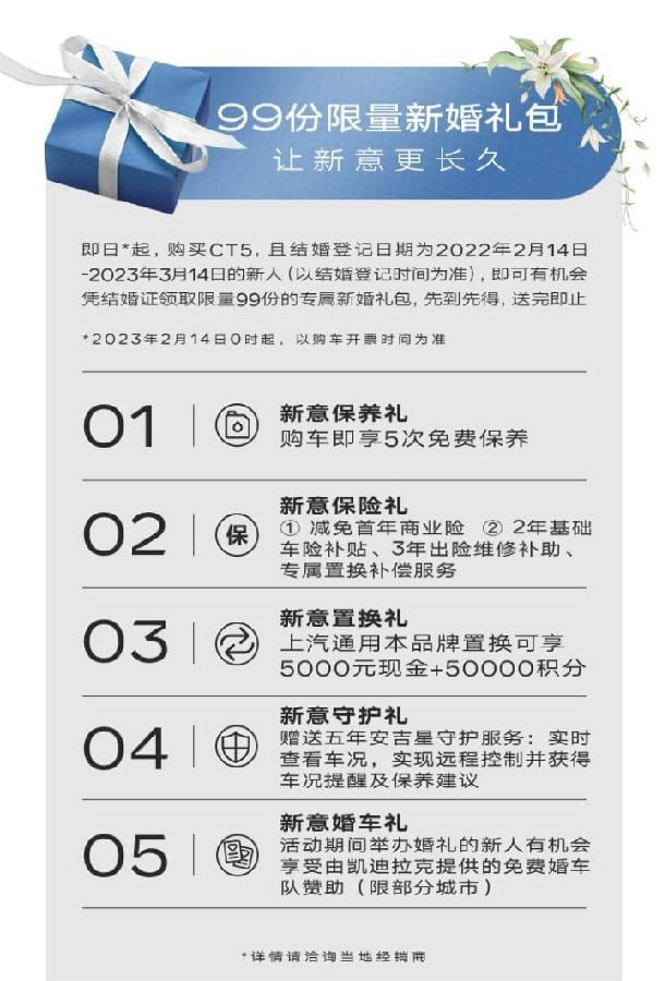 百年时光流转,创造、勇气和爱始终如新,凯迪拉克CT5让婚礼、日常生活处处有新惊喜,一车两人,新意相守。值得注意的是,当下入手凯迪拉克CT5还有机会领取限量99份的专属新婚礼包。礼包包括了新意保养礼,购车即享5次免费保养;新意置换礼,上汽通用本品牌置换可享5000元现金+50000积分等优惠,送完即止,各位准新人赶紧去看看吧。