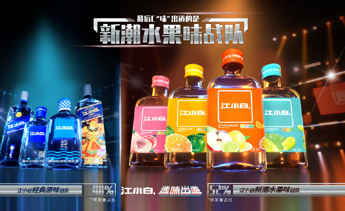 当然,即使是低度白酒,对于很多年轻人来说,依然难以接受白酒入喉时的辛辣感,于是,江小白推出了果立方系列,该系列包含四款口味——卡曼橘味、白葡萄味、混合水果味、蜜桃味。蜜桃味酒精度为23%,其他三款都为15%,每款果汁含量超过30%。入口不但不会辛辣,还能感受到酒香与果香混合后的奇妙滋味。从包装上来说,江小白果立方系列也更像是饮料一样,橙黄粉蓝的鲜艳色彩,无不展示着青春与活力,于是,果立方系列一经推出,就收到广大年轻消费者的喜爱。