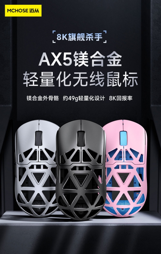 迈从AX5全系搭载镁合金外骨骼,兼顾轻量强度和手感。约49g轻量化设计,经典模具手感再升级。支持8K回报率,操控极尽丝滑。PAW 3395传感器、Nordic 52840/博通高配主控、26000 DPI六档可调、TTC光微动/防尘金微动、滚轮TTC金轮编码器、标配4K/8K接收器、三模连接、超长续航,提供多个配色及配置版本可选,堪称镁合金鼠标届旗舰杀手!