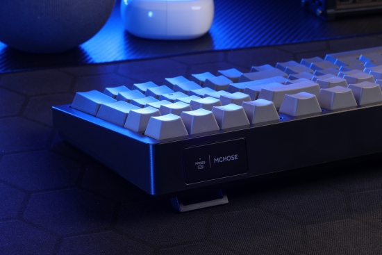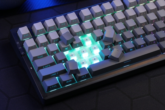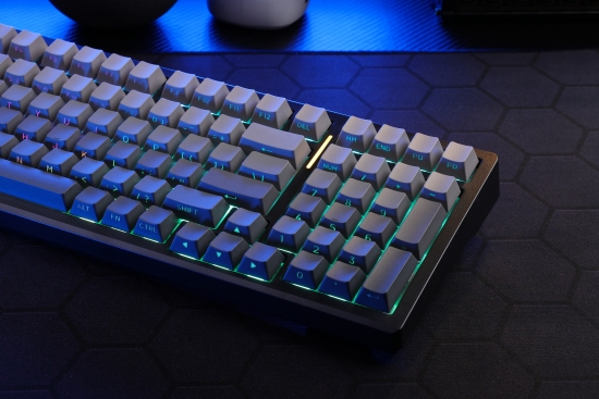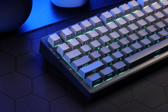 半极黑搭配白菜豆腐轴V2,下灯位和匀光镜的加持,高清字符光效在指尖跳动。