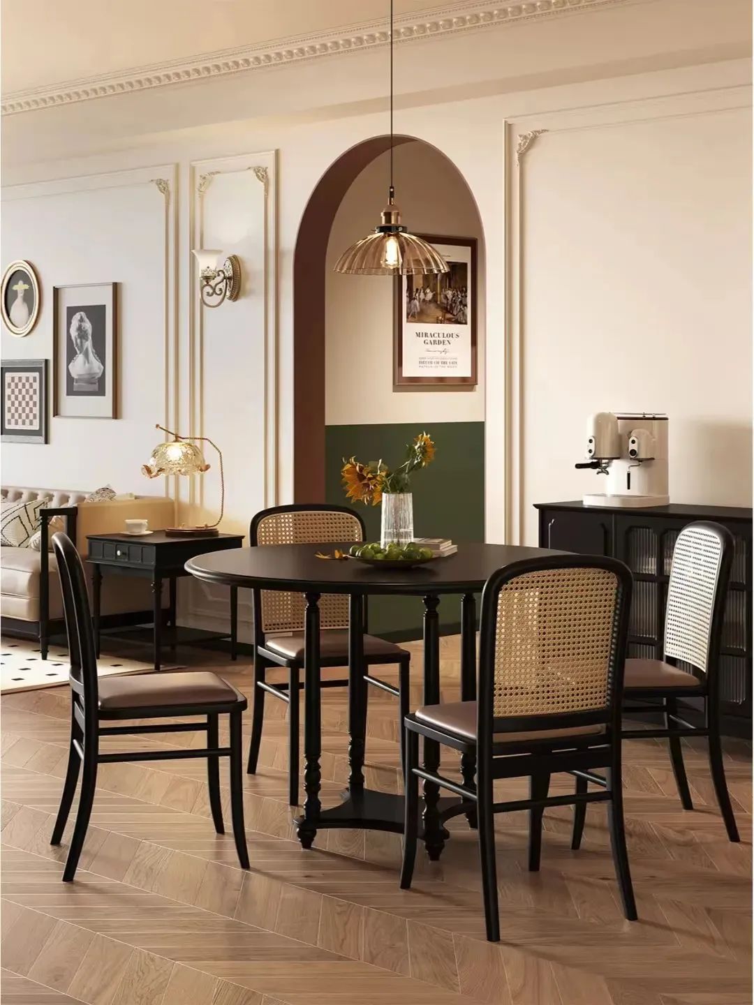 ③如果喜欢聚餐,且餐厅空间很大,可选择更大的圆桌,若圆桌直径超过1.4m,建议加个转盘。