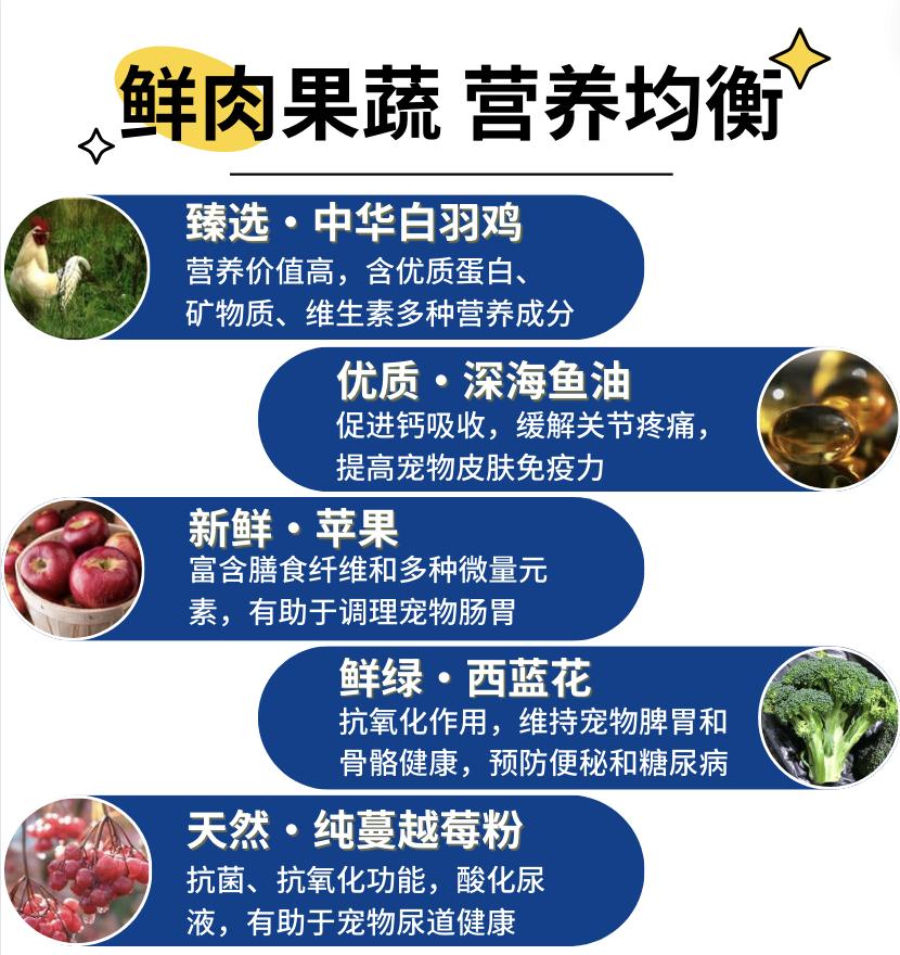 为了实现营养均衡,配方中特别添加了苹果、西兰花、车前子和蔓越莓等多种蔬果。有肉、有果、有蔬,这些食材既丰富了猫粮的口感,也为猫咪提供了丰富的维生素、矿物质和微量元素。苹果和西兰花含有丰富的纤维素,可以促进消化;蔓越莓则富含抗氧化物,有助于提高猫咪的免疫力,保持身体健康。
