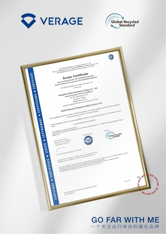 维丽杰(VERAGE)品牌自创立以来,始终致力于环保事业,67年来持续推动行业绿色发展。近期,维丽杰(VERAGE)箱包产品也成功获得全球回收标准(GRS)4.0认证,标志着维丽杰在可持续材料应用、绿色生产工艺及闭环供应链管理领域达到国际先进水平。全球回收标准(GRS)是国际环保纺织品协会(Textile Exchange)所制定的一项严格标准,要求企业从原料采购到生产加工再到物流环节实现全程可追溯。维丽杰凭借先进管理系统,精确追踪R-PET材料从回收源头到成品的每一步流转,为客户提供产品环保属性的透明化保障,增强市场对维丽杰环保承诺的信任度。