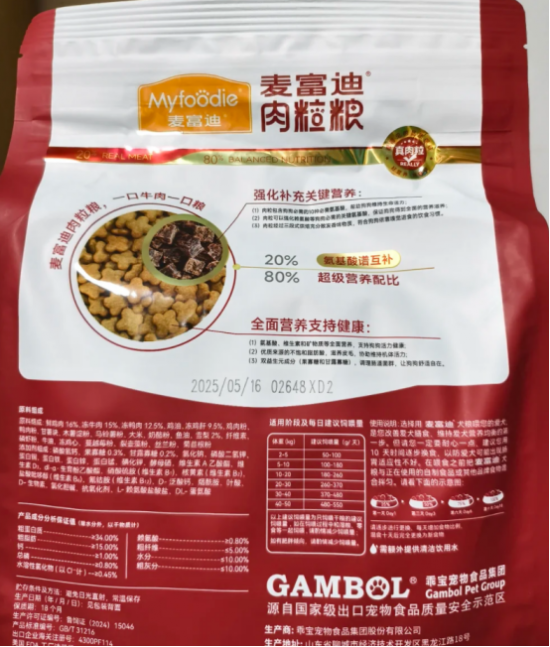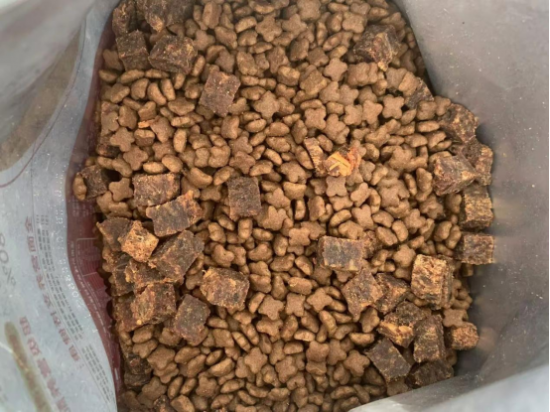 还记得第一次拆开包装,我就被惊艳到了。这可不是市面上那些“挂羊头卖狗肉”的“概念性肉粒”,而是实实在在、饱满完整的大块肉粒!我养狗这么多年,买过无数号称“含肉粒”的狗粮,可大多数产品的肉粒,要么碎得像粉末,要么就是染色肉粉冒充的。但麦富迪这款粮里的肉粒,不仅个头大,纹理还特别清晰,我用手轻轻掰开,能看到里面真实的肉质纤维,这品质,简直没话说!