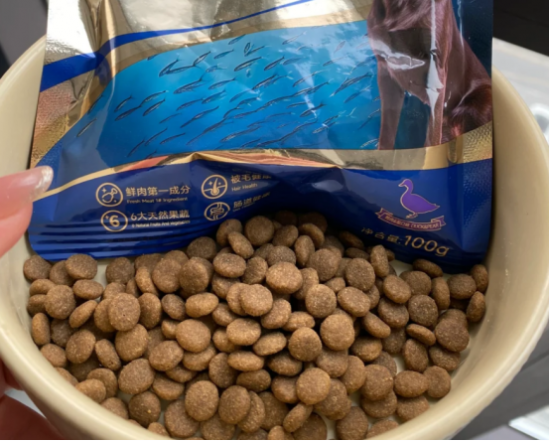 仔细观察犬粮颗粒,能发现设计上的巧思:大小适中的椭圆形颗粒表面干燥清爽,手指捏握后不会留下油渍。第一次喂的时候,我特意观察了狗狗的进食状态——虽然很爱吃但并没有狼吞虎咽,也没有像吃某些添加诱食剂的食物时那样急切。这种自然的进食状态,无添加的配方,让我对这款粮有进一步的好感了。