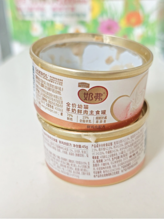 45g小小一罐,分量刚好。开罐就能闻浓浓的奶香味,连我都想拿个勺子尝一尝,难怪我家小倔猫每次听到开罐声音都欲罢不能的。质地也是十分细腻柔滑的,慕斯绵密的口感完全不需要嚼,特别适合幼猫舔食。而且营养指标很出色,50%粗蛋白+18%粗脂肪,堪称黄金比例的高营养,一段时间吃下来,我家小猫的体型确实强壮了不少,现在一摸身上,都是紧实的腱子肉,效果还是挺明显的。