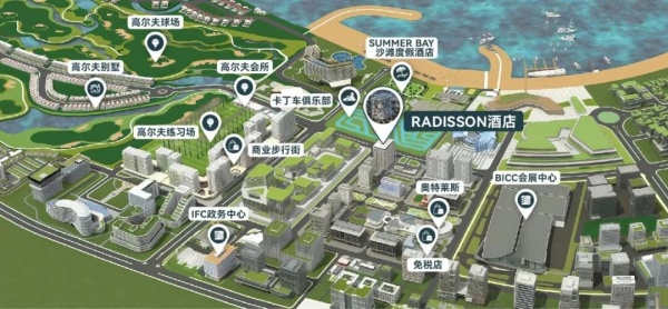 Radisson酒店集团此次新项目落址于“鼎沙湾”核心——BICC 国际会展中心片区,占尽开发先机。周边奥特莱斯、免税店及高尔夫球场等高端配套环伺,更将受益于2026年政府行政中心东迁、西港机场扩建和金西高速通车等重大利好,预计每年将吸引约65万人次到访。