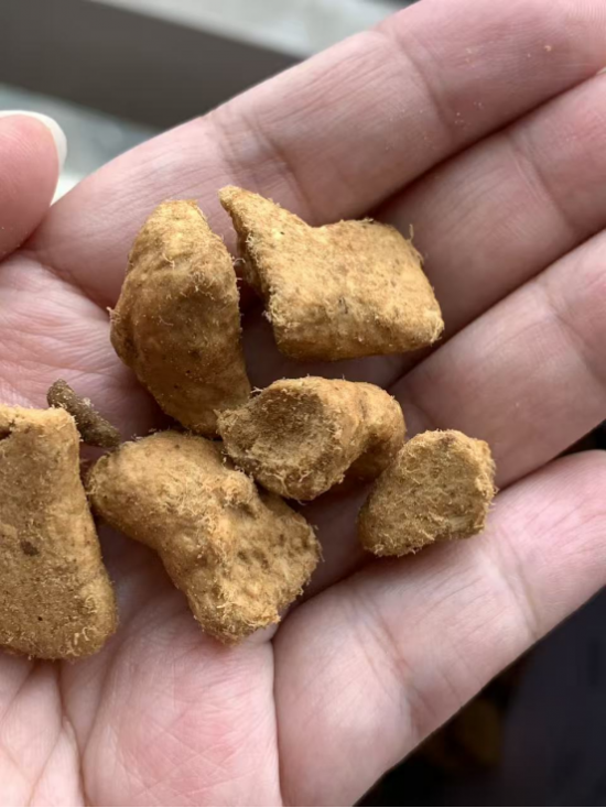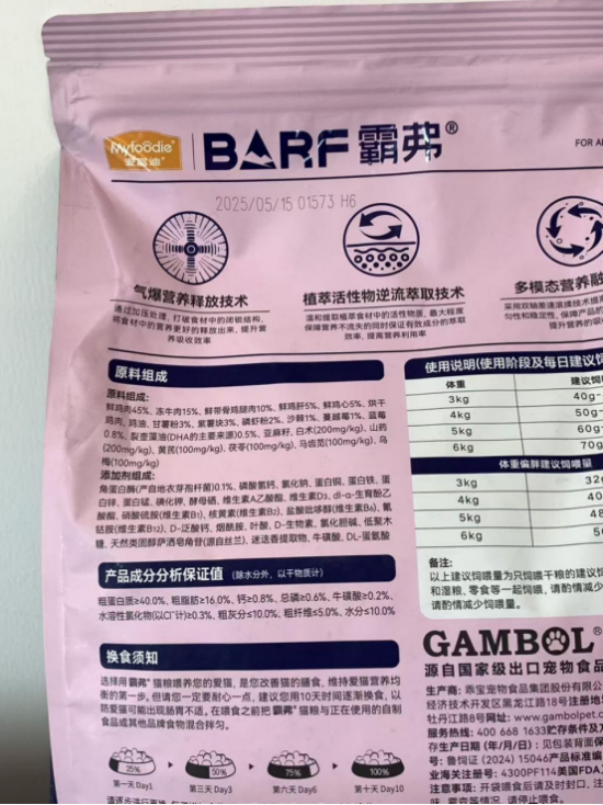 能看到里面有超多大块生骨肉冻干的添加,肉香味儿自然,猫猫被天然鲜肉吸引,适口性,。麦富迪超级工厂,工艺相当前沿,WENGER TX85生产线的高鲜肉直投技术,结合-36℃急速冷冻干燥工艺,在避免高温加工的同时,极大限度保留了鲜肉的原始营养。通过自主研发的"气爆技术"(专利号:202310234787.7),麦富迪成功实现多元营养素在分子层面的深度融合,显著提升营养生物利用率。实验室数据显示,该产品胃蛋白酶消化率高达94.4%,营养吸收效率显著优于传统宠物食品。特别添加110亿CFU/kg活性菌群,与三重益肠植萃形成闭环调节,实测可降低粪便异味。