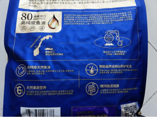 再吃这款粮之前我家狗狗掉毛情况还是挺厉害的,期间也尝试过给狗狗喂食鱼油,可是这个小家伙压根不老实,眼看着放到嘴里,一转头的工夫就吐在它自己的狗窝里了。也听朋友推荐了几款含鱼油的狗粮,可是一打开就有一股子鱼油味道,狗狗一闻就不吃。
